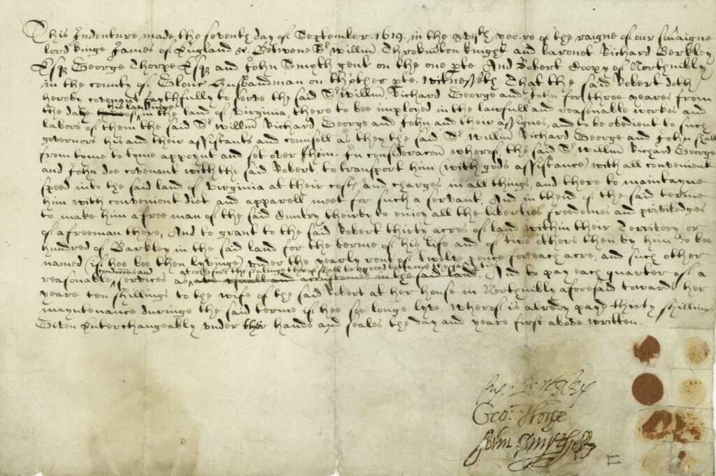 [Witnesseth] that the said Robert doth hereby [covenant] faithfully to serve the said S’Willm, Richard, George, and [John] for three years from the date his landings in the land of Virginia, there to be employed in the lawful and [reasonable] works and labors of them the said S’Willm, Richard, George, and [John] and their assigns, and to be obedient to [such] governors his and their assistants and counsel as they the S’Willm, Richard, George, and [John] shall from time to time, appoint and set over him. In consideration whereof, the said S’Willm, Richard, George, and [John] do covenant with the said Robert to transport him (with God’s assistance) with all convenient speed into the said land of Virginia at their cost and charges in all things, and [there] to maintain him with convenient diet and apparel meet for such a servant, and in the end of the said [terms] to make him a free man of the said Country, thereby to enjoy all the liberties, freedoms, and privileges of a freeman there. And to grant to the said Robert thirty acres of land within their territory or a hundred of Barkley in the said land for the term of his life and of two others then by him to be named (if he be then living) [under] the yearly rent of twelve pence for each acre, and such other reasonable [conditions] and services as [at or before the signing thereof shall be agreed between the said parties.] And to pay each quarter of a year ten shillings to the wife of the said Robert at her house in North Nibly aforesaid towards her maintenance during the said term if he so long live, Whereof is already already paid thirty shillings. Given interchangeably under their hands and seals the day and year first above written.