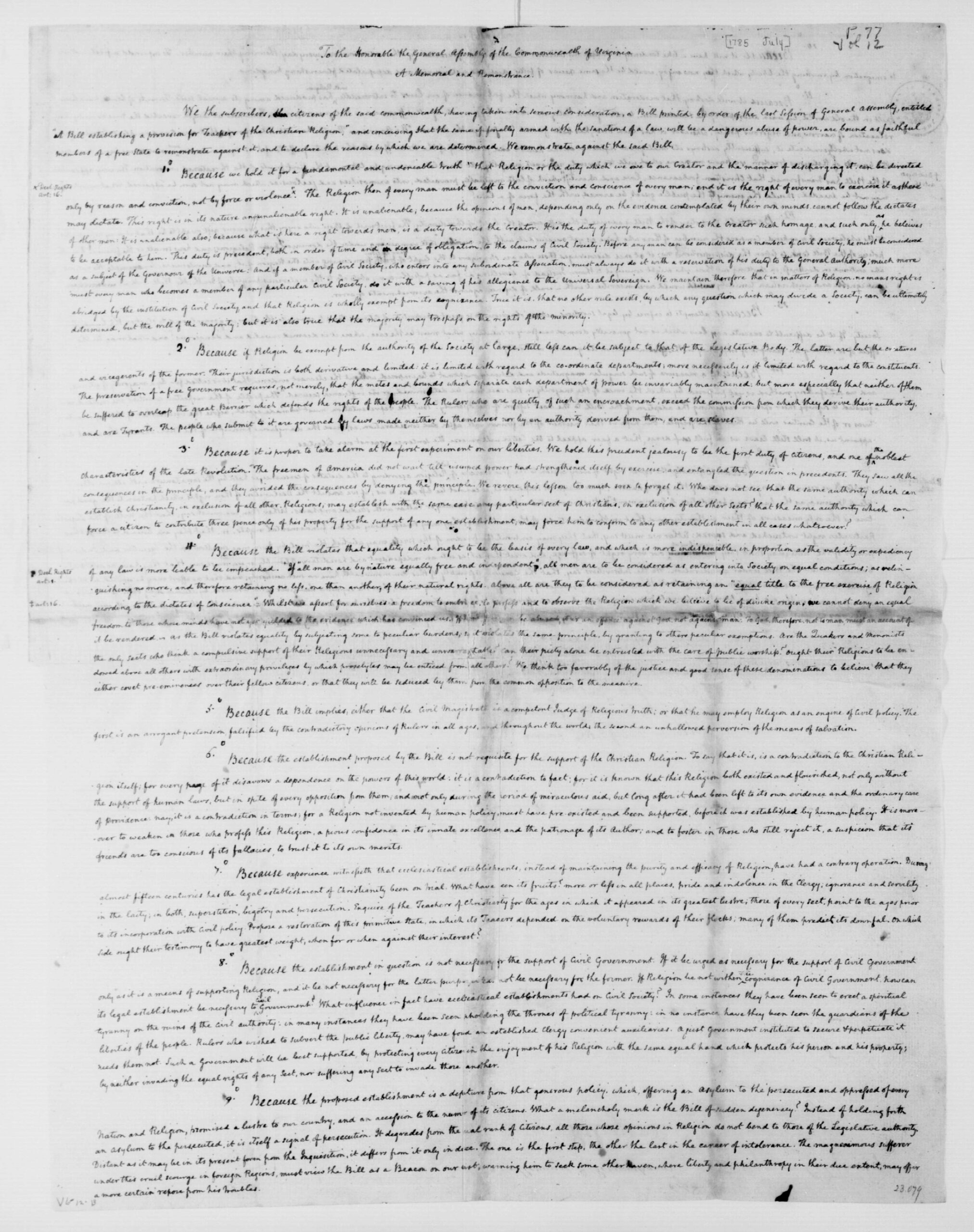 The “rights” listed in the first five sections might strike the contemporary reader as odd; it is important to remember, however, that among the most fundamental rights articulated by the revolutionary generation was the right of the people to choose their form of government. Note the articulation of the separation of powers doctrine. Sections six through fourteen cover familiar ground. Most of the civil rights and criminal procedures listed were part of the Americanized version of the “rights of Englishmen” tradition. Section fifteen reflects the traditional republican argument that free government could survive only if the people were virtuous. Because colonial America turned to religion to perform this important political function, there was a presumption that religion had an “established” status. In 1776, the Anglican Church was the established church of Virginia, and there is nothing in the Virginia Declaration of Rights that challenges this establishment. On the other hand, Madison incorporated into Section sixteen an argument for the free exercise of religion, claiming that “the duty which we owe to our CREATOR, and the manner of discharging it, can be directed only by reason and conviction, not by force or violence.” This assertion challenges the establishment of any particular sect, even for the purpose of inculcating the morality that Madison himself elsewhere argued was essential to republican government.